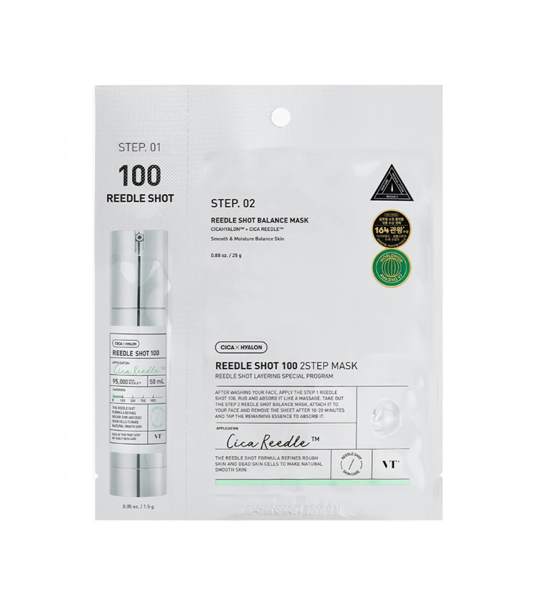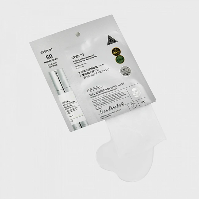 Продукт состоит из двух этапов: бустер-сыворотки Reedle Shot 100 на основе микроигл в средней концентрации, которая подходит для базового ежедневного ухода для всех типов кожи, и тканевой маски, которая усиливает действие сыворотки и глубоко увлажняет, препятствуя появлению раздражения.